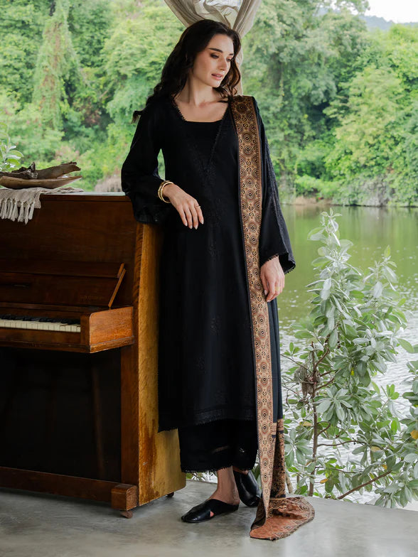 Wrapped in midnight black, Asteria exudes understated power and grace. Crafted from premium Italian wool, it is detailed with subtle embroidery and paired with a richly patterned jacquard shawl, creating an aura of refined sophistication
