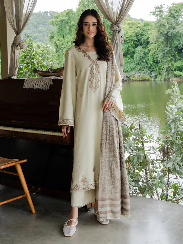 A vision of understated elegance, crafted from premium Italian wool in a soft pastel hue. The shirt is adorned with delicate embroidery on the front and sleeves, balanced with a plain back for refined simplicity. Paired with a stunning jacquard shawl in earthy tones and plain dyed woolen trousers, this is a must-buy for your winter wardrobe