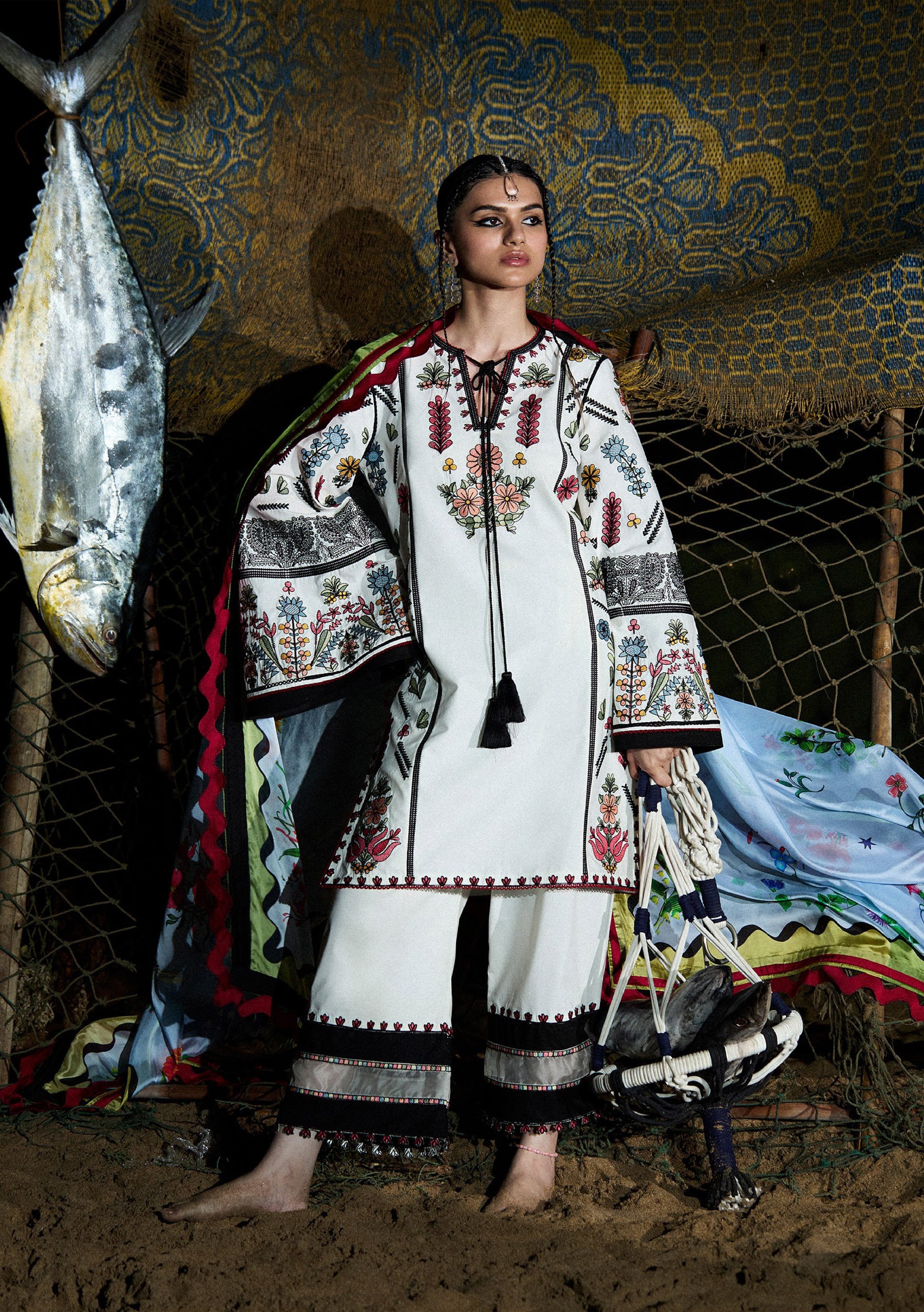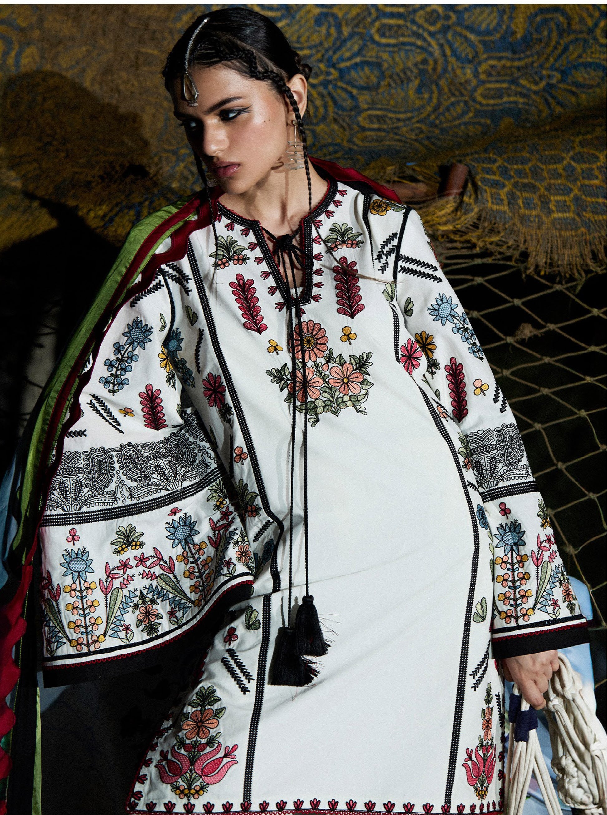 Description: This outfit is a refined take on traditional wear, featuring an ivory shirt with detailed multicolor embroidery that runs along the front, sleeves, and borders. The matching culottes carry the same embroidered patterns, finished with bold black and red bands at the hem for a clean, structured contrast. A digitally printed silk dupatta adds movement and color, with floral motifs and a scalloped border in deep magenta and green tones. The overall look is grounded yet expressive—rooted in craft, with a contemporary edge.