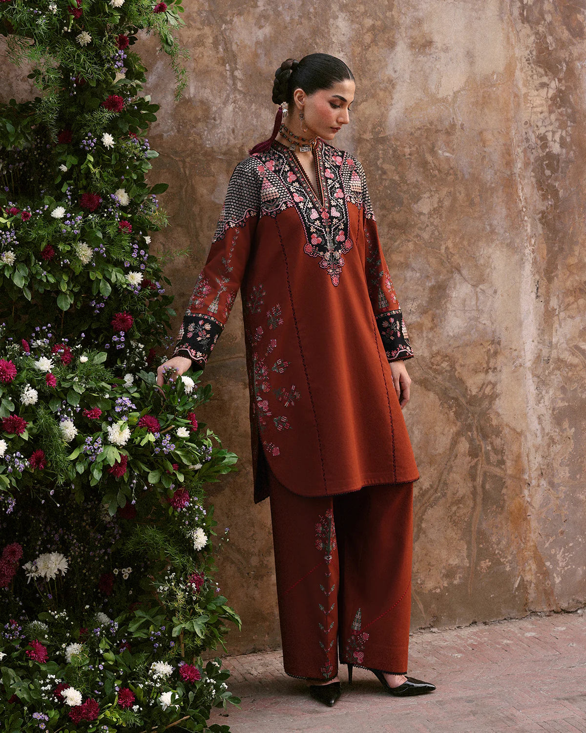 - Embroidered Front Back Right Panel (Rust Khaddar) 2 Pieces